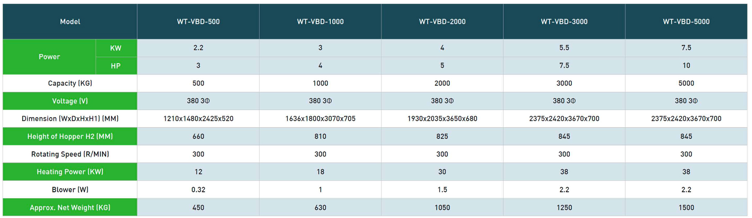 • Con función de calentamiento y secado para opción: doble capa aislamiento térmico Diseño de tolva de calefacción Euro para reducir pérdida de calor. Con baja temperatura superficial, equipado con función de protección de disparo por sobrecalentamiento, ahorro de energía y seguro. Soplador de media presión con gran volumen de aire.